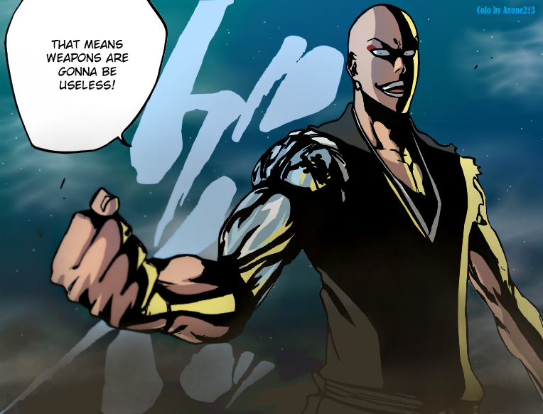 In today’s EPIC Fight between Moe Shishigawara, with his Fullbring: Jackpot Knuckle, and Ikkaku Madarame and his Hozukimaru, we already know that the captains and lieutenants are having a Win streak so we’d except for Ikkaku to have one too! And that’s exactly what we get!Moe Shishikawara broke Ikkaku Madarame’s Hozukimaru which meant Ikkaku had nothing but his fists to fight with! (And Head of course 😉 ).