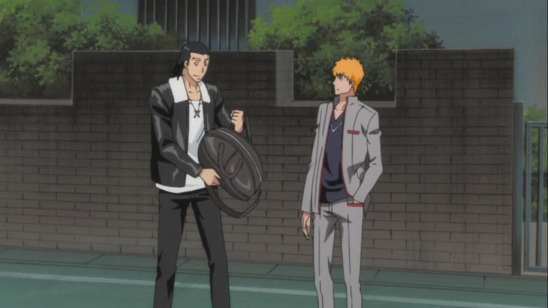 During the end of the day, Ichigo notices a man with a bag being chased by another man (Kugo Ginjo) with black leather jacket. Ichigo helps out the mysterious man in leather jacket by punching the thief across the face. Ginjo asks if Ichigo wants to get some Ramen, but Ichigo denies the request.