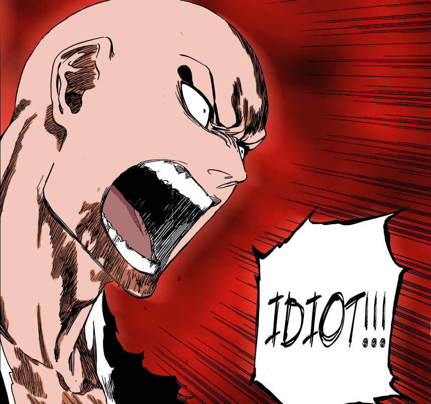 Ikkaku screams at Moe till he realise’s what kind of action his taking. Moe’s face at the end of this seems as though he knows what is going to happen, and there’s nothing more he can do but to face Ikkaku straight on.