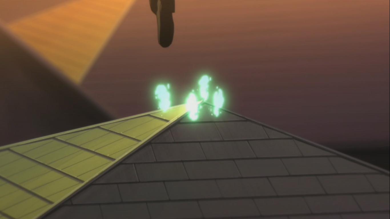 Ishida heard a page flip from Shukuro Tsukishima‘s book (Fullbring: Book of the End). Quickly he searched for the mysterious man who escaped him before from the tree. Ishida looked up and saw a mysterious man walking on top of the wires. Shukuro Tsukishima used a similar technique to Flash Step (Hoho/Shunpo) to quickly move from building to building. Ishida quickly followed and noticed that Tsukishima was using a different type of Flash Step (Hoho) which released 4 different green sparks when releasing the step.