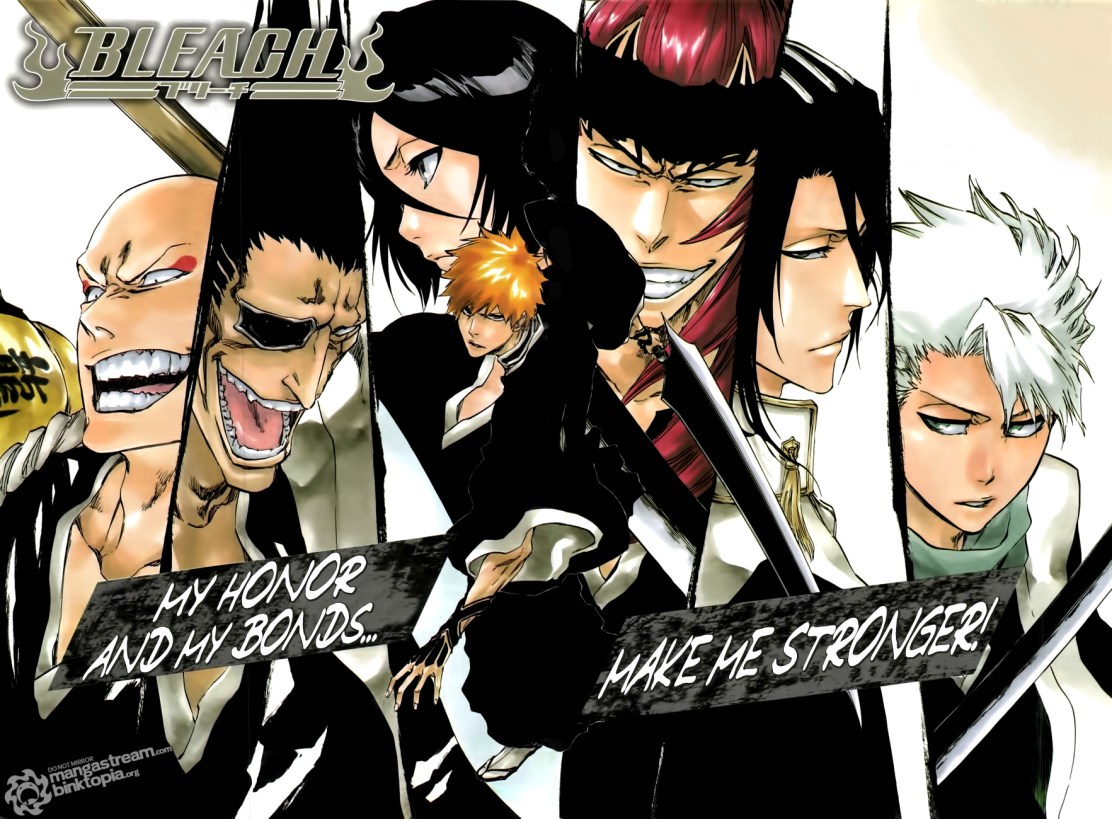 An image taken from the Shonen Jump (Weekly Jump) during Bleach 469 Manga. “My Honor And My Bonds… Make Me Stronger!” quoted within the image unites Ichigo Kurosaki with Kuchiki Rukia, Renji Abarai, Zaraki Kenpachi, Kuchiki Byakuya, Ikkaku Madarame and Toshiro Hitsugaya.