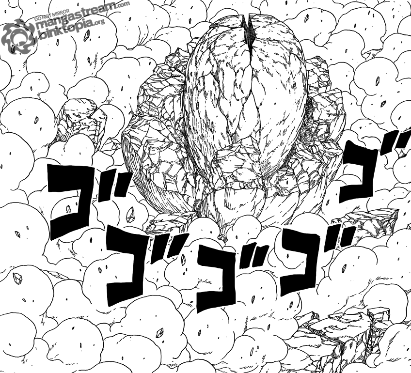 In Today’s Naruto 561, titled “The Power in a Name”, has Tsuchikage Onoki fight to push a large meteor sized rock coming down from the sky.