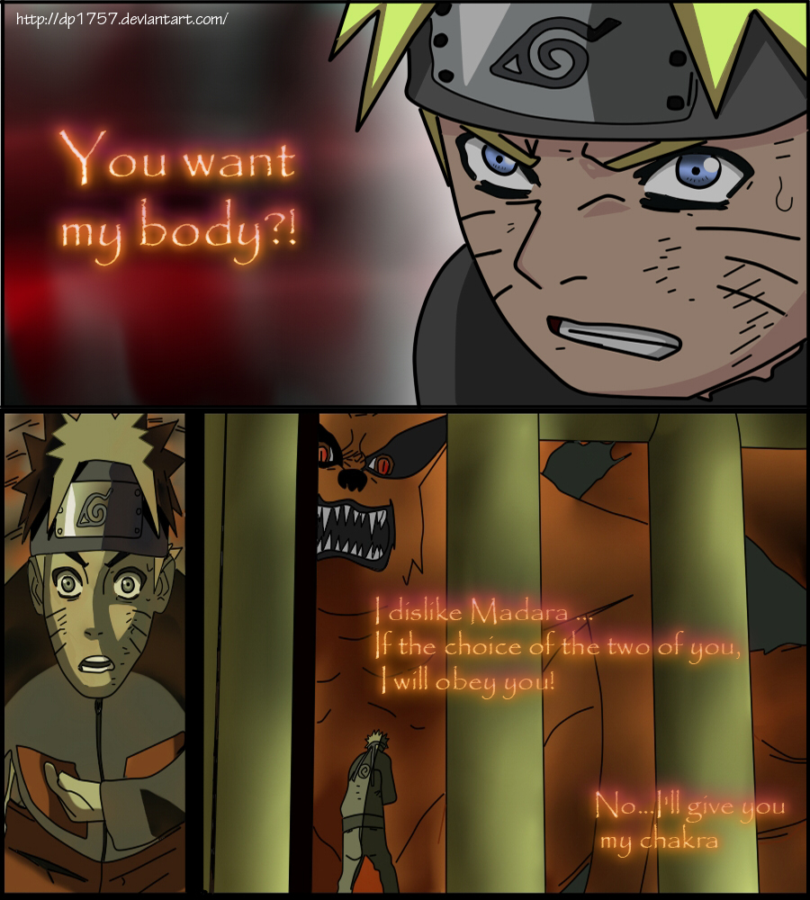“This Chakra… I Remember this Chakra! Madara!” is what the Kyubi says. After the Demon Fox also says “Naruto… This time I’ll lend you my Power”, Naruto replies with “You Want My Body Now?!”. The Kyubi says “No… I will give you my chakra, and it alone!”, “I dislike Madara… If the alternative is being controlled by him… I Choose You!”