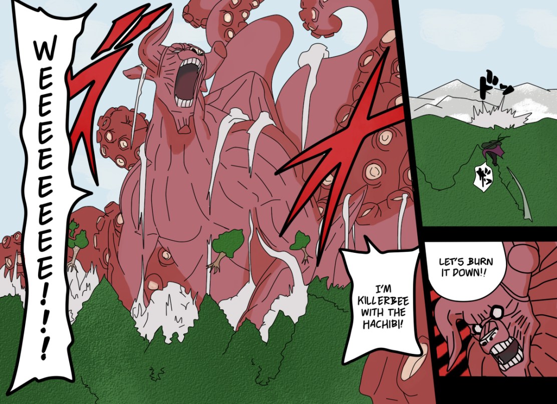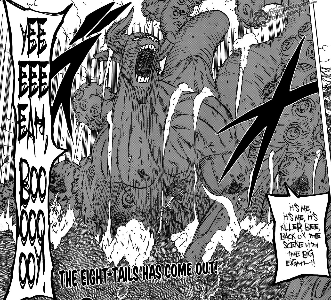 Since Killer Bee’s always walking around in sunglasses, his vision isn’t very good in darker condition, such as, in this area. So what he does, is he releases he’s Eight-Tailed Jinchuuriki to create space so there is light in that area. “Blow this forest to kingdom come! It’s me, It’s me, It’s Killer Bee back on the scene with the Big Eight!”. And it ends here! Another fantastic Chapter!