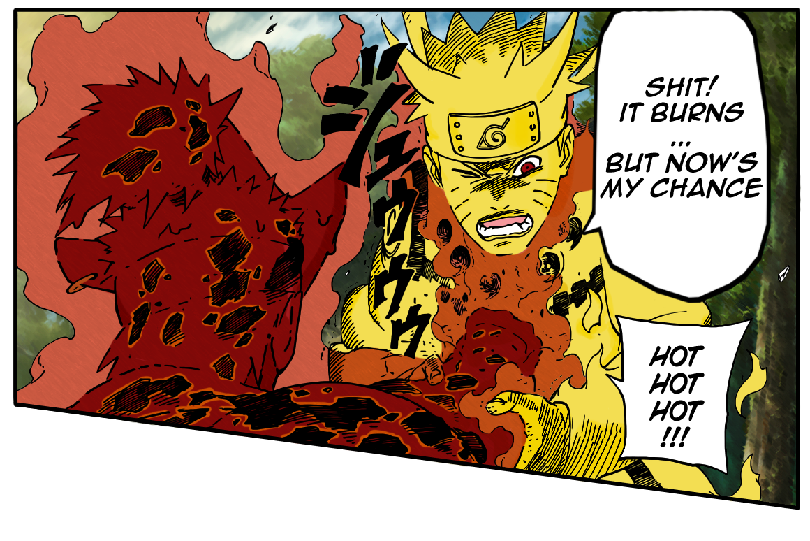 Naruto thinks back to Pain’s fight, and remembers that all Six Pains, were controlled by black rods which were acting as a chakra receptor for the host. Killer Bee notices that on Yugito’s Breasts she has a black rod shape which acts as a receptor. Naruto try’s to see if the rod shape is on other Jinchuuriki’s, he fights Roshi, the Four-Tailed Jinchuuriki and finds that he also has a black rod. While trying to get rid of the chakra receptor, Naruto gets kicked on the face, FAIL!.