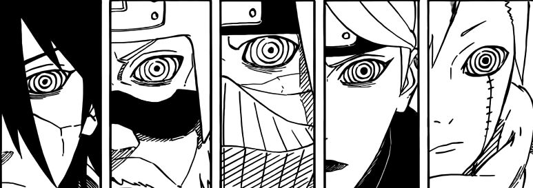Naruto explains to Killer Bee, “It’s just like when i fought the six paths of Pain! Their rinnegans are all connected, each one sees what the others see!”. That’s probably the cleverest thing Naruto has said in a long time 😛 . The technique, Six Path of Pain was used by Nagato during the destruction of the Leaf Village. Since they are literally unbeatable, Naruto and Killer Bee would have to come up with some sort of plan to beat them.