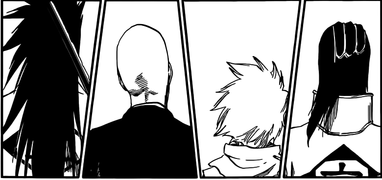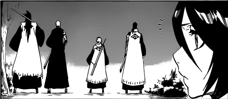 When Rukia becomes conscious she realizes that Ichigo is still in the pocket reality made by Yukio’s Invaders Must Die. She notices that Zaraki, Madarame, Hitsugaya and Byakuya are there doing nothing. In Rukia’s Inner thoughts “With this many captain-class fighters, if we launched an all-out attack, can we really not break apart that box?”. This is not about destroying the box, but actually waiting for something to happen. I’m pretty sure that they could easily break the pocket reality with in swing. But what are they waiting for? Could they be waiting for Ginjo to tell Ichigo about the truth about the Combat Pass?