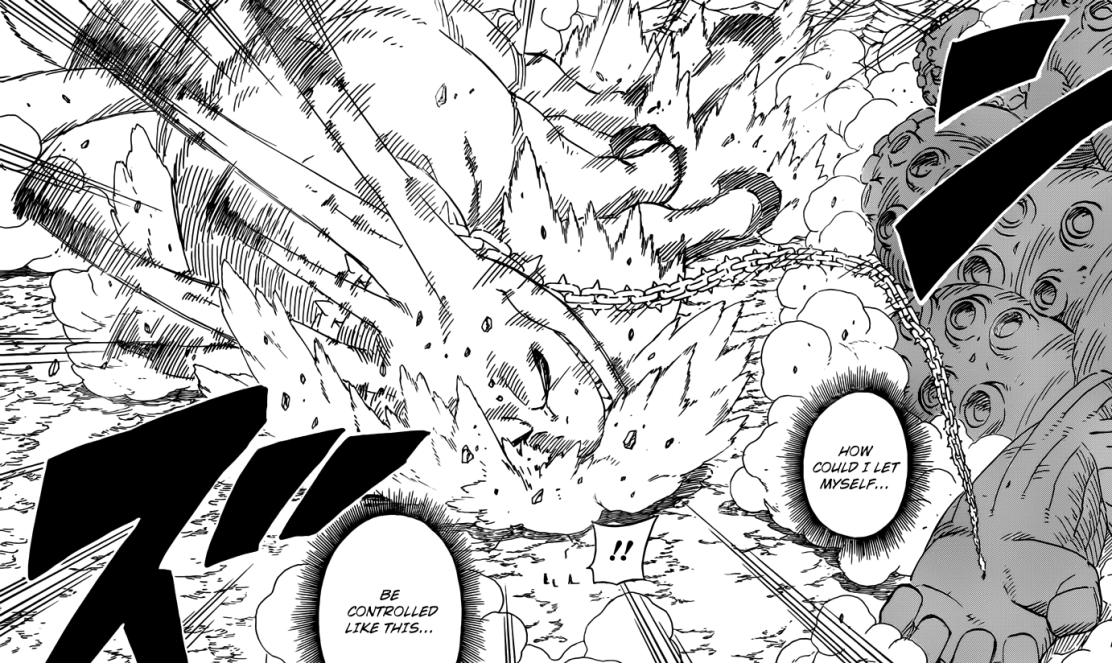 During the chapter, both Kakashi and Guy tried attacking the tailed beast but miserably failed as they didn’t have any black receptors which Pain had. Tobi knew that Konoha would come up with a way to defend themselves and destroy the receptors and to stop the technique. Kakashi used “Thunder Slash and Guy used “Eight Gates #6: The Gate of View-Open”.