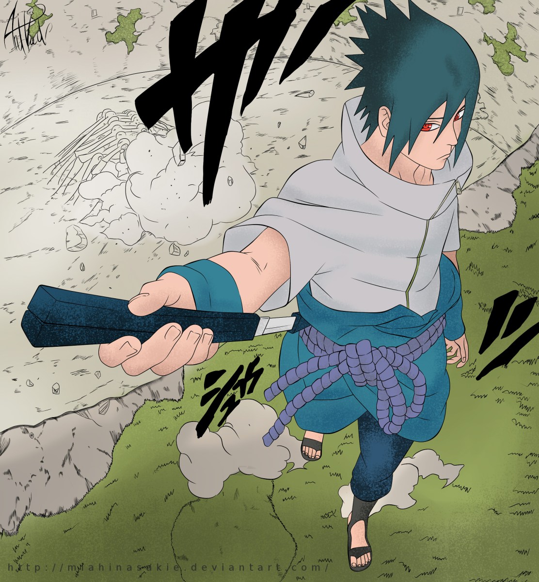 Naruto 567 started off by Sasuke slicing up an object then jumping to that grass patch that he’s standing on. As the title says, Sasuke Joins The Battle, Sasuke is on his way to joining both Naruto, Killer Bee, Tobi and the other Jinchuuriki’s. From what I can see, the object he sliced up doesn’t seem to be something from the Five Great Shinobi Nations, therefore he must still be training by himself.