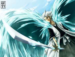 Hitsugaya is the Captain of the 10th Division with Rangiku Matsumoto being her Lieutenant. Toshiro’s Bankai has been revealed quite a few times during fights and movies. Therefore we’ve gotten used to his ice attacks and angel ice wings. His Bankai, Daiguren Hyorinmaru has the ability to cause ice to flow from Hyōrinmaru to Hitsugaya, starting at his right arm which ice forms with the shape of a dragon’s head around his sword hand, encasing the sword up to the hilt; which also changes from the shape of a four-pointed star to that of eight-pointed star. The ice continues forming up over his shoulders with two large wings sprouting from his back and a long tail. The ice forms down his left arm encasing his hand which ends in a claw. Hitsugaya’s feet are encased in ice in a similar way to his left hand which as they to end in claws.