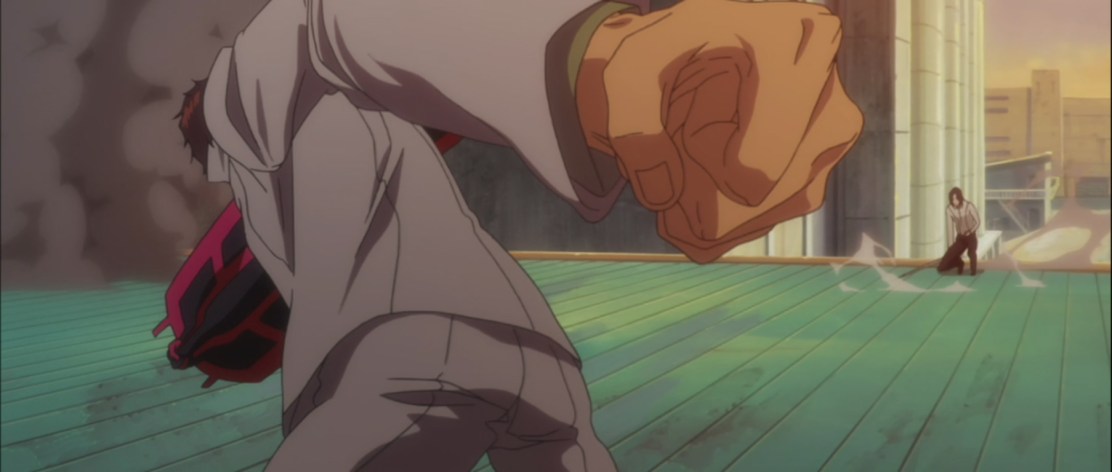 Angry Chad, opens his Fullbring and starts out with a massive explosive attack. Both Chad and Tsukishima start to fight on top of a building while Orihime helps her using her powers.