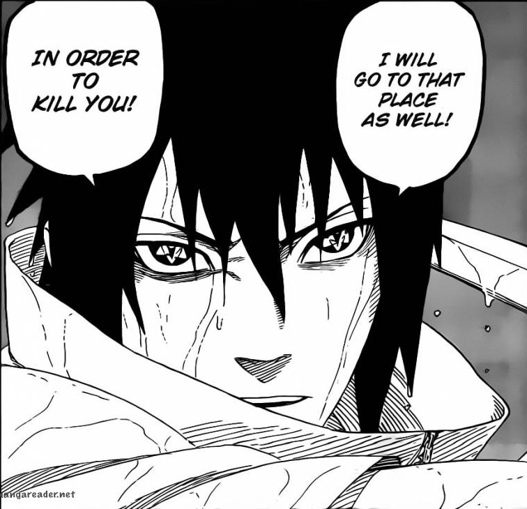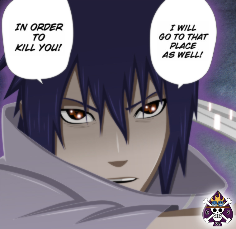 Sasuke rhetorically asks “Did you forget it Naruto, What true Strength is…?”, and while he opens his sword, he slices the head of the Zetsu. “I will go to that place as well, in order to kill you!” says Sasuke towards Naruto.