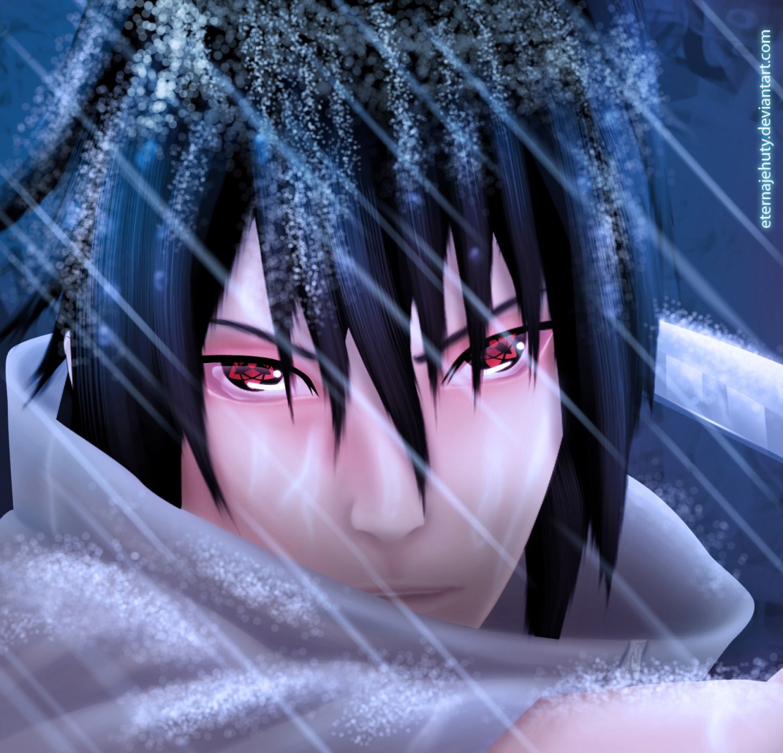Sasuke notices that he is getting more and more accustomed to the eyes of his brother. Sasuke remembers the time when Itachi had demanded Sasuke to have the same eyes as him, then he could fight him. Sasuke then reminisces about his brother Itachi. Sasuke then sheathes his sword and moves on.