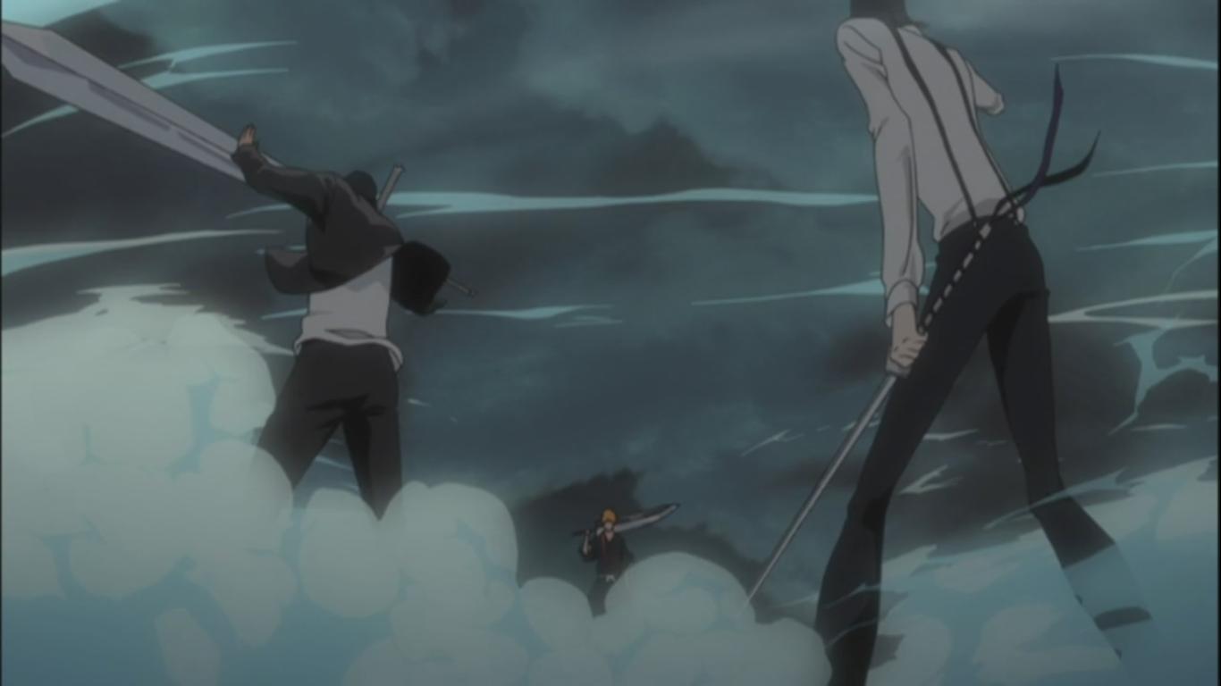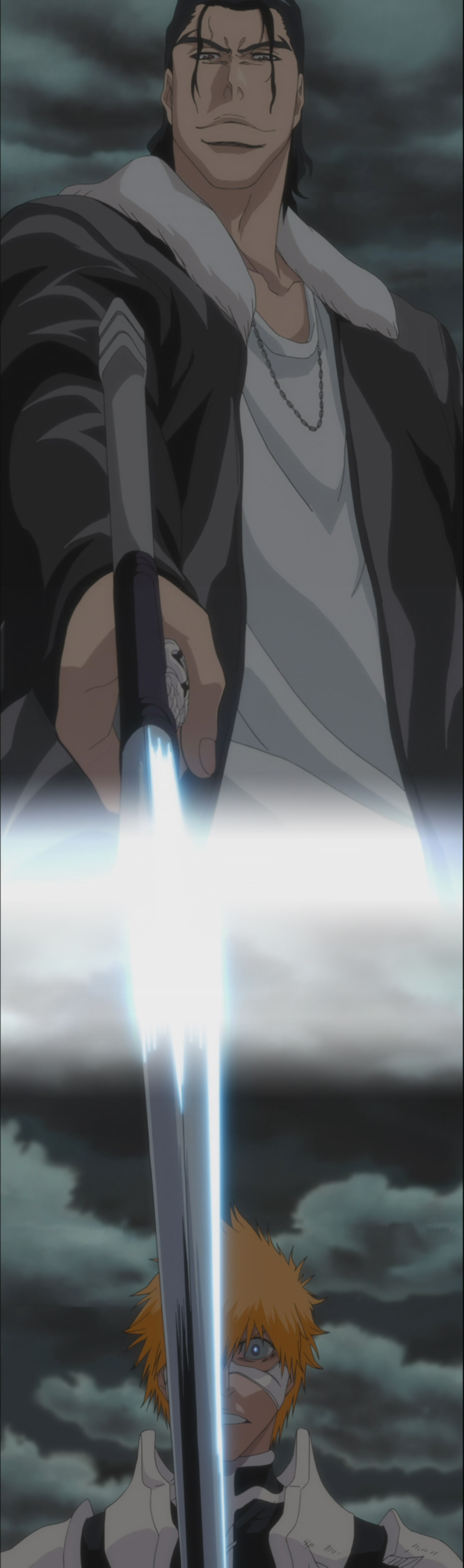 As Ichigo shouts to get Ginjo’s attention, while a sword stabs Ichigo from the back. Ichigo turns his head and sees Isshin and Urahara. Isshin tells him that he wasn’t the one who stabbed him. He looks at the base of the sword and notices that Rukia has materialized in front of him.