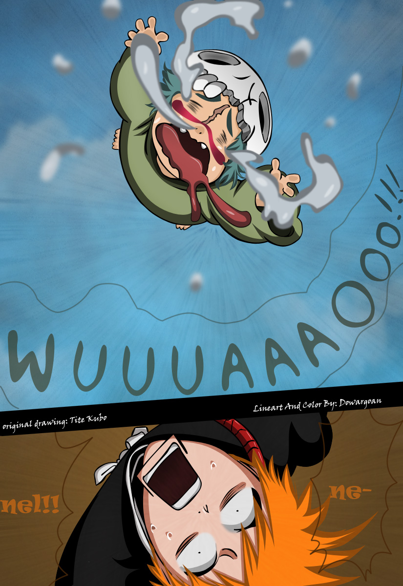 Ichigo notices that something is flying really fast, he sees that it’s Nelliel Tu Odelschwanck or Nel for short. She lands directly on Ichigo. She tells him that something is bad, she asks for Ichigo’s help as “Hueco Mundo is…”.