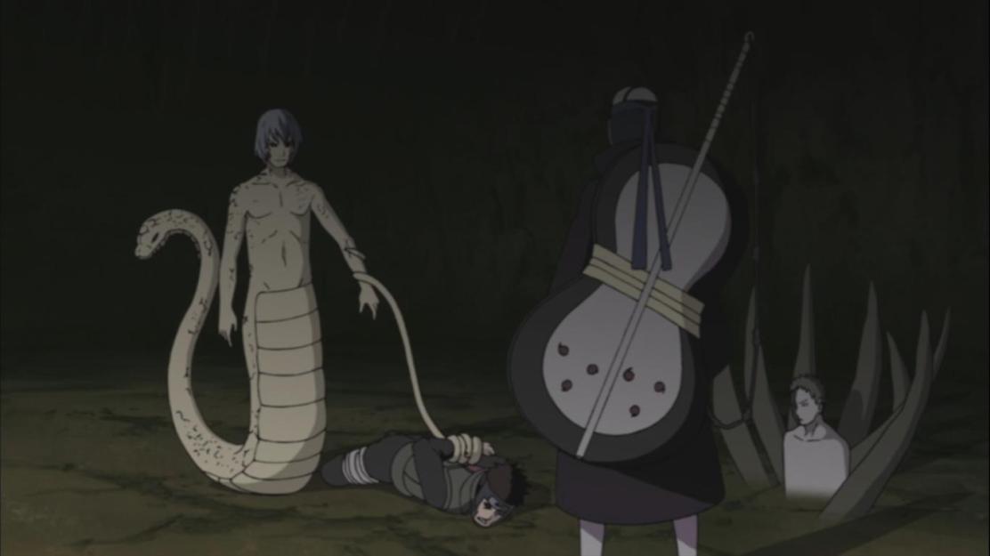 The snake holds the turtle tightly at the neck to prevent him from moving. At this point, Motoi, Aoba and Yamato come to see what is going on, while Kurotsuchi is up flying. She spits Corrosion Style: Quicklime Jutsu which she uses and misses, she then uses Water Style: Water Trumpet to make the quicklime liquid to spread it out even further to make Kabuto step on it to capture him. She then sends more quicklime to hold him in place.