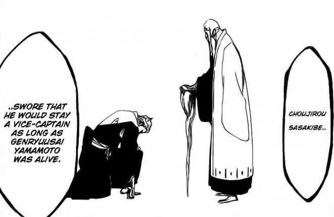 Choujirou Tadaoki Sasakibe was the lieutenant for the First Squad. He was able to master his Bankai before Kyouraku and Ukitake but had never asked to be put with the captains in the ranks. He even refused to be a Substitute Captain for a while till they got a new captain. He had done this solely due to his respect for Yamamoto.