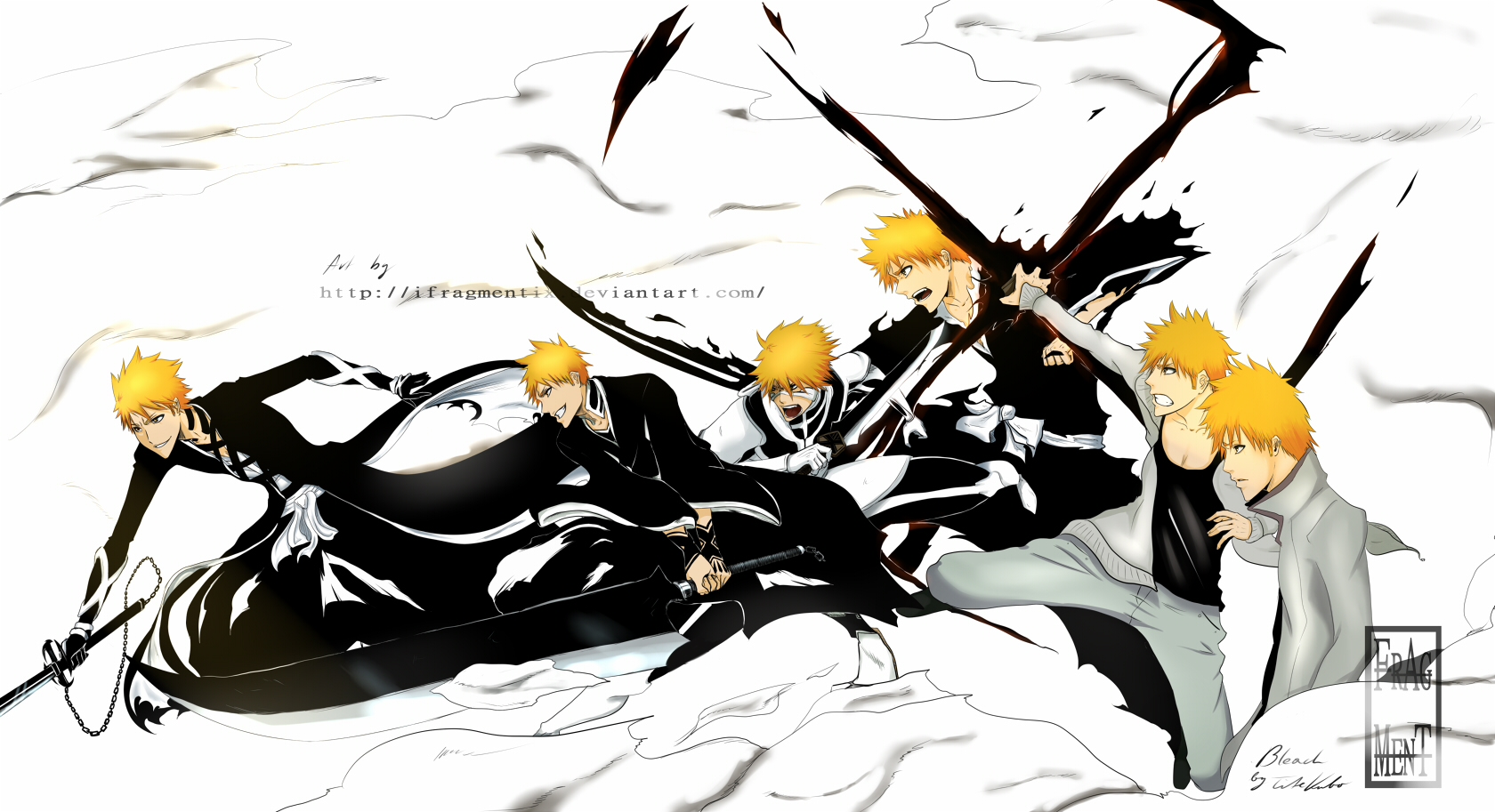 After Ichigo lost his Shinigami powers, he returned to his normal self with no power’s at all. He trained with Ginjo to retain some of his Shinigami Powers to protect his family and friends from harm. The evolution of these forms go from right to left.