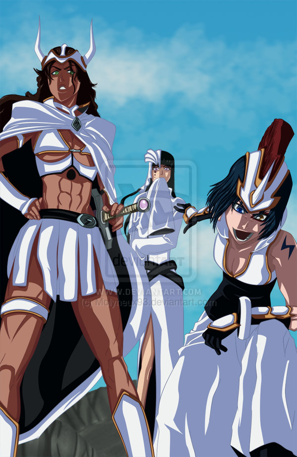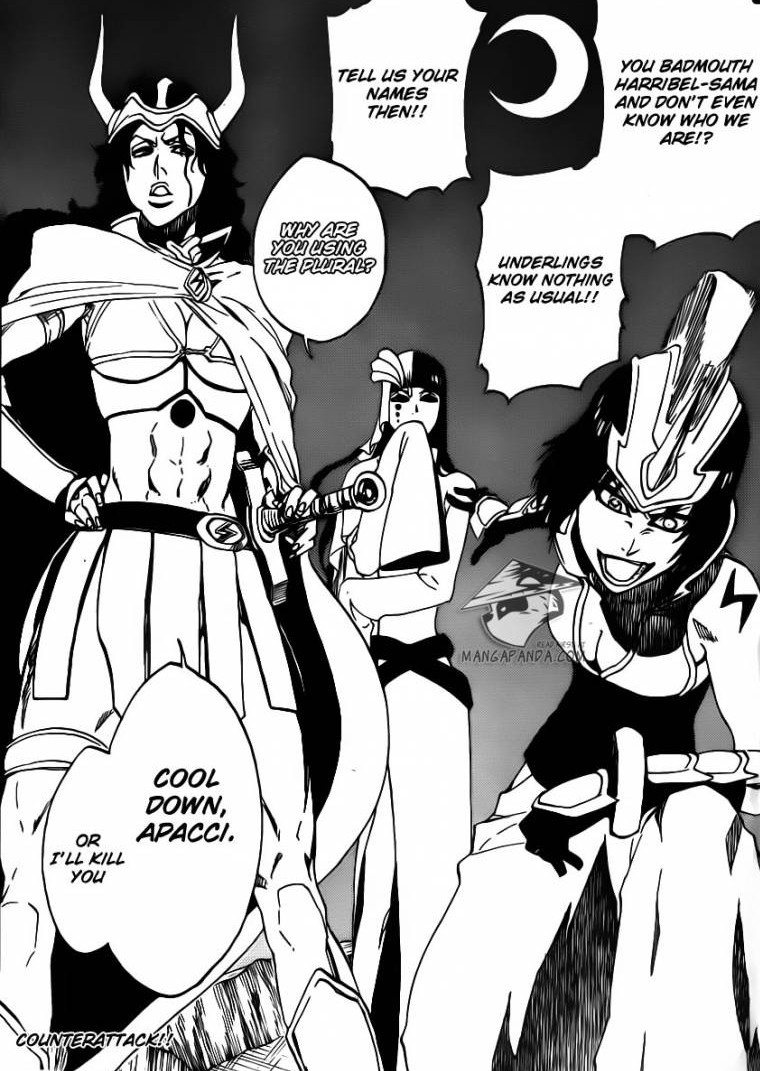 A circular object appears from nowhere and it destroys the soldiers which were there to capture Loly and Menoly. Kirge turn around to stop the circular object. He finds that Emilou Apacci, Cyan Sung-Sun and Franceska Mila Rose are there to protect the name of Harribel as well as to defeat Kirge Opie for killing so many Arrancar’s and Hollows. The Chapter Ends here.