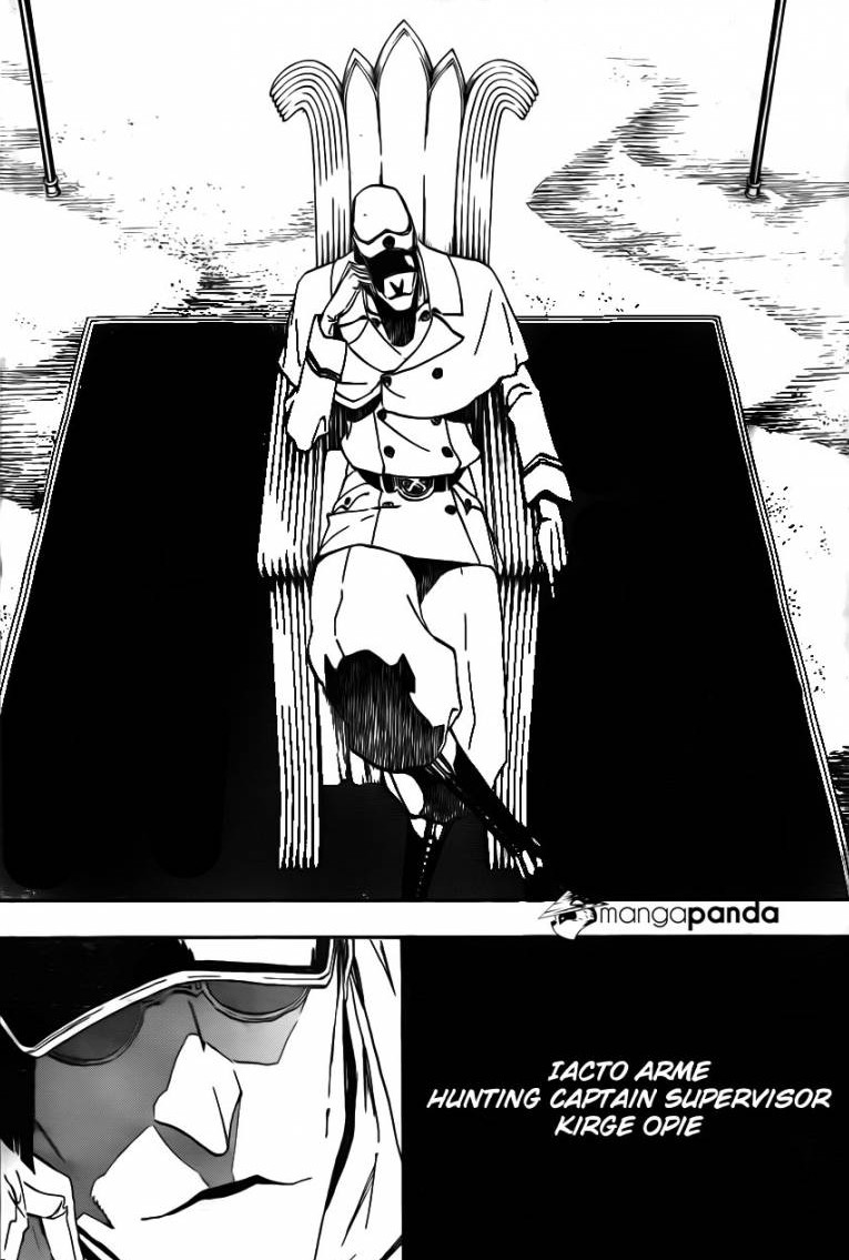 Kirge Opie, who is the Hunting Captain Supervisor of the Iacto Arme is sitting down on his chair until some more Arrancar and Hollows come to the place and told to stand alongside the wall. Kirge Opie stands up, two mysterious people talk to discuss who the leader might be. Kirge Opie stands and tells every Arrancar and Hollow that they will die unless they kneel in front of him and lick his shoes.