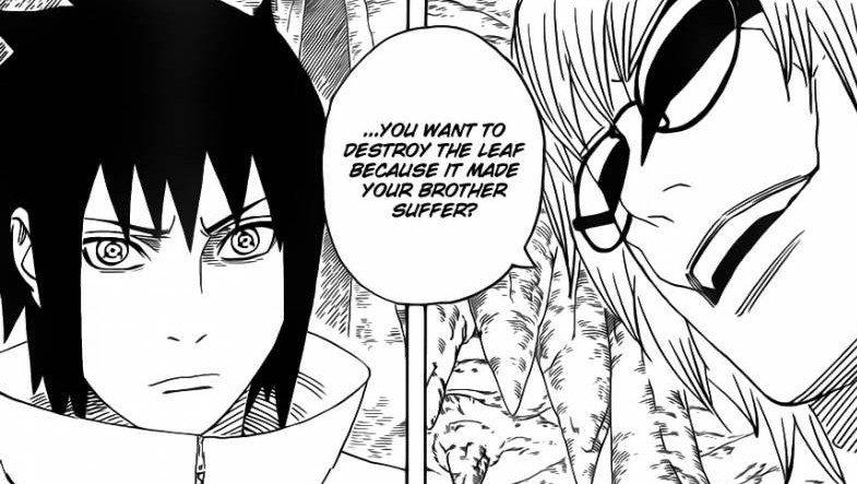Kabuto asks Sasuke, since they have a similar goal, if Sasuke wants to stab Itachi in the back and come join Kabuto to destroy the Leaf. He then mocks Sasuke and tells him that he shouldn’t feed guilty because he’s not technically betraying Itachi since he’s only a wooden doll.