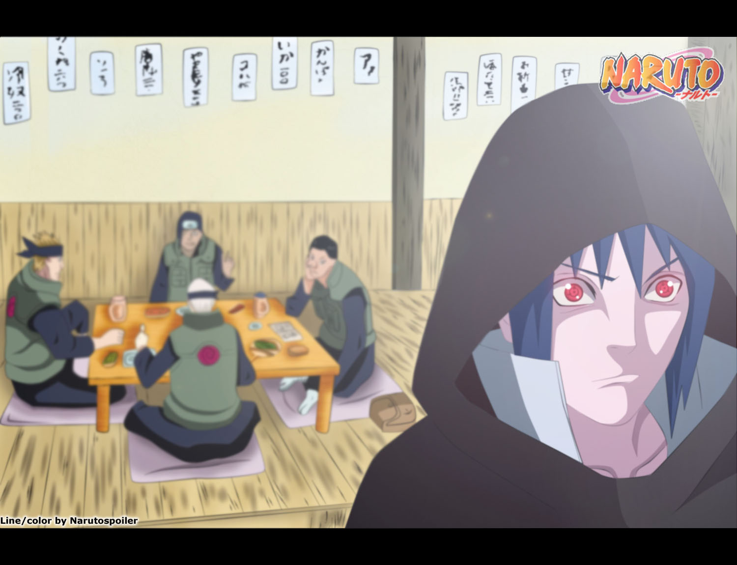Sasuke remembers the past where he’s in a bar where some Leaf Ninja’s are talking about Itachi. They mention that he’s a traitor and it’s a good thing that he died. They also mention that he’s one of the most atrocious villains in the village’s history. At this point, Sasuke opens his Sharingan and get’s really pissed off. Beside him is Tobi, who’s trying to calm him down, he mentions that they don’t know the truth about Itachi and he’s duties, he had done this to save the Leaf Villages themselves.