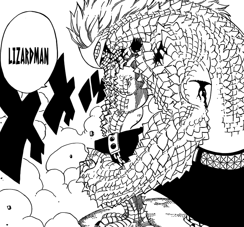 As they both get ready to fight, Elfman speaks Beast Soul while Bacchus just goes for the attack. Elfman transforms and Bacchus notices he’s arms, they are all hurt and bruised due to he’s hands being the object which hit the Beast Soul Lizardman. Elfman challenges Bacchus to hit him to see which one will last longer, this will determine the winner.