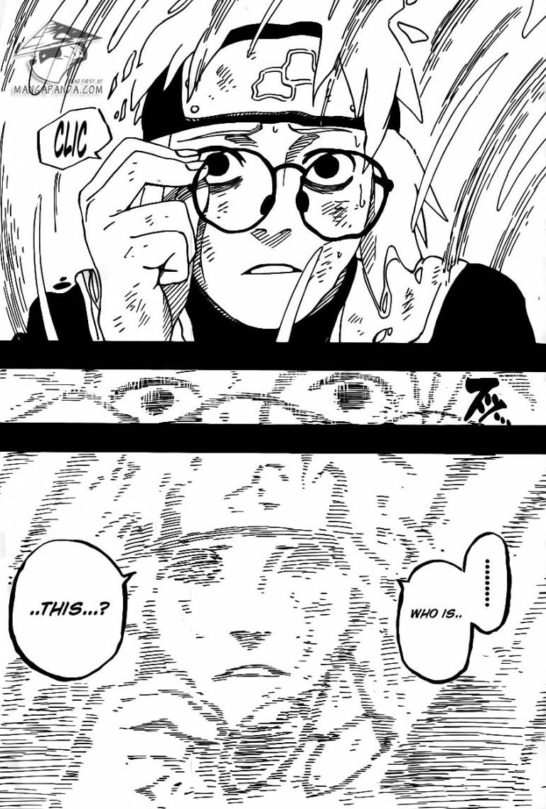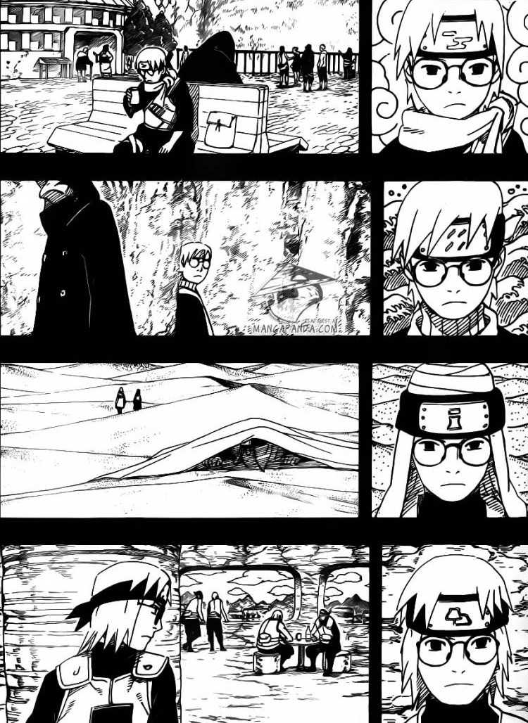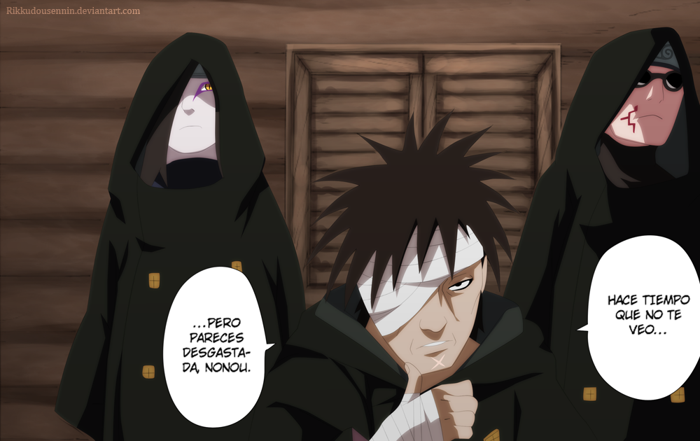 Nonou quickly asks who it is, Kabuto replies that its him. He gives her his glasses so she could see better, then replies with It’s Kabuto. But when she see’s who it is, she doesn’t recognize him even as she wears his glasses. At this point, Kabuto is damn shocked as she wasn’t able to work out who he was. Some Ninja’s fall by and refer to Nonou as Nanigashi, probably her latest identity.