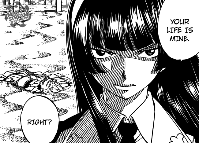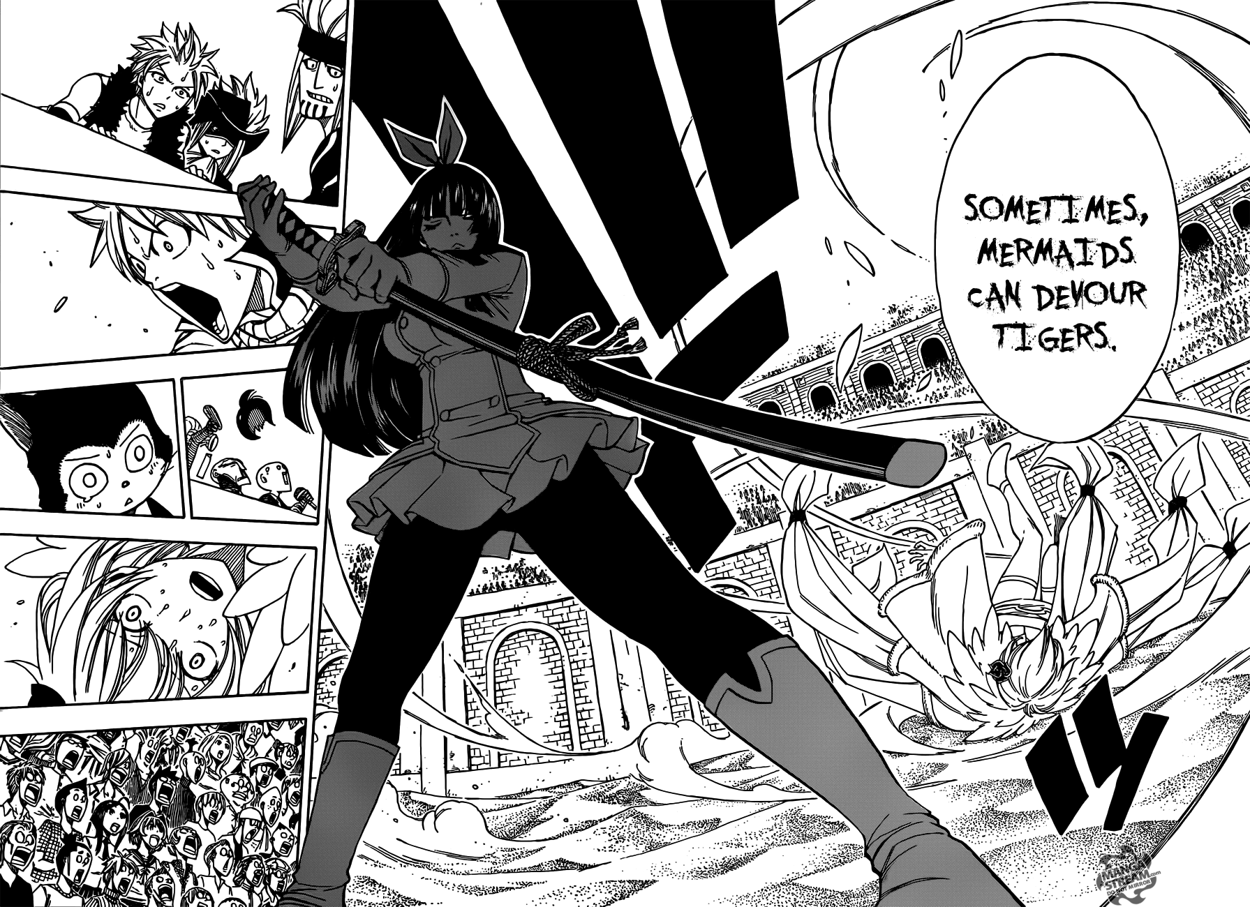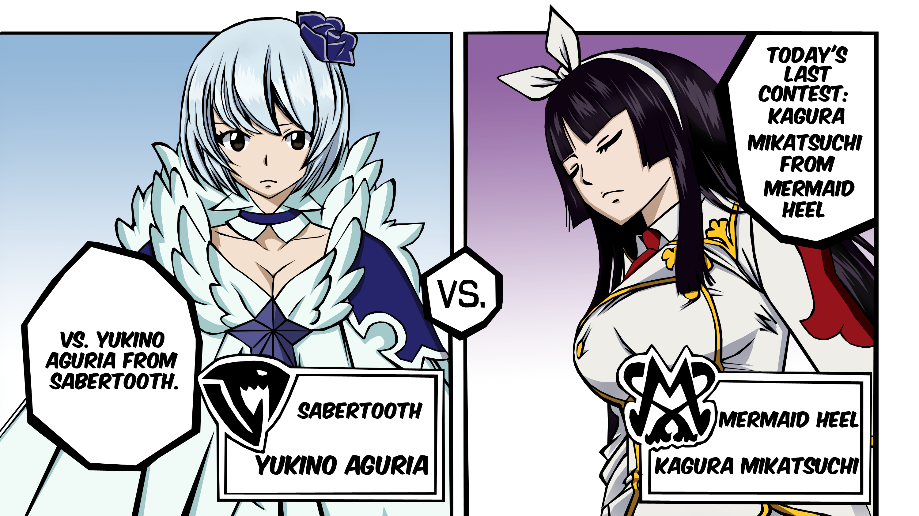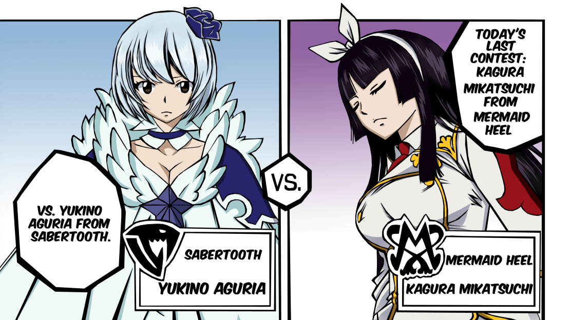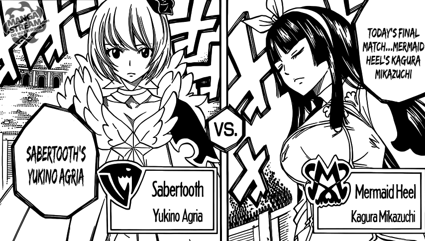 We start of the chapter as Kagura Mikazuchi is chosen from Mermaid Heel and Yukino Agria from Sabertooth. Everyone cheers because it’s another fight between two beauties. Sting asks Yukino Agria if she knows the meaning to be on Sabertooth. She must not lose because this would mean that they’d lose their spot as one of the best guilds.