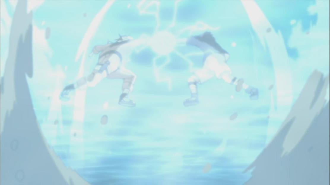 As he comes down the statue and waterfall, Sasuke releases he’s Chidori and Naruto releases he’s Rasengan, Sasuke realizes that Naruto’s Rasengan was able to counter he’s Chidori. As Sasuke comes by, he stabs Naruto using he’s Chidori to realise that Naruto is now using the powers from Kurama.