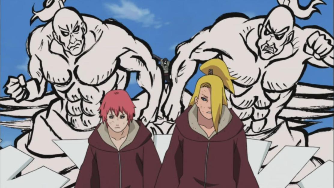 Sai shouts his brother’s name as it explodes. Omoi was protected by the puppet while Sai was hit pretty hard. The book which Sai holds is lying on the grass. Sai notices that Deidara called Shin a bomb. As Shin regenerates, Sai gets damn pissed and draws a bird. Then he draws two large human like which literally smash the hell out of both Deidara and Sasori from the sky.