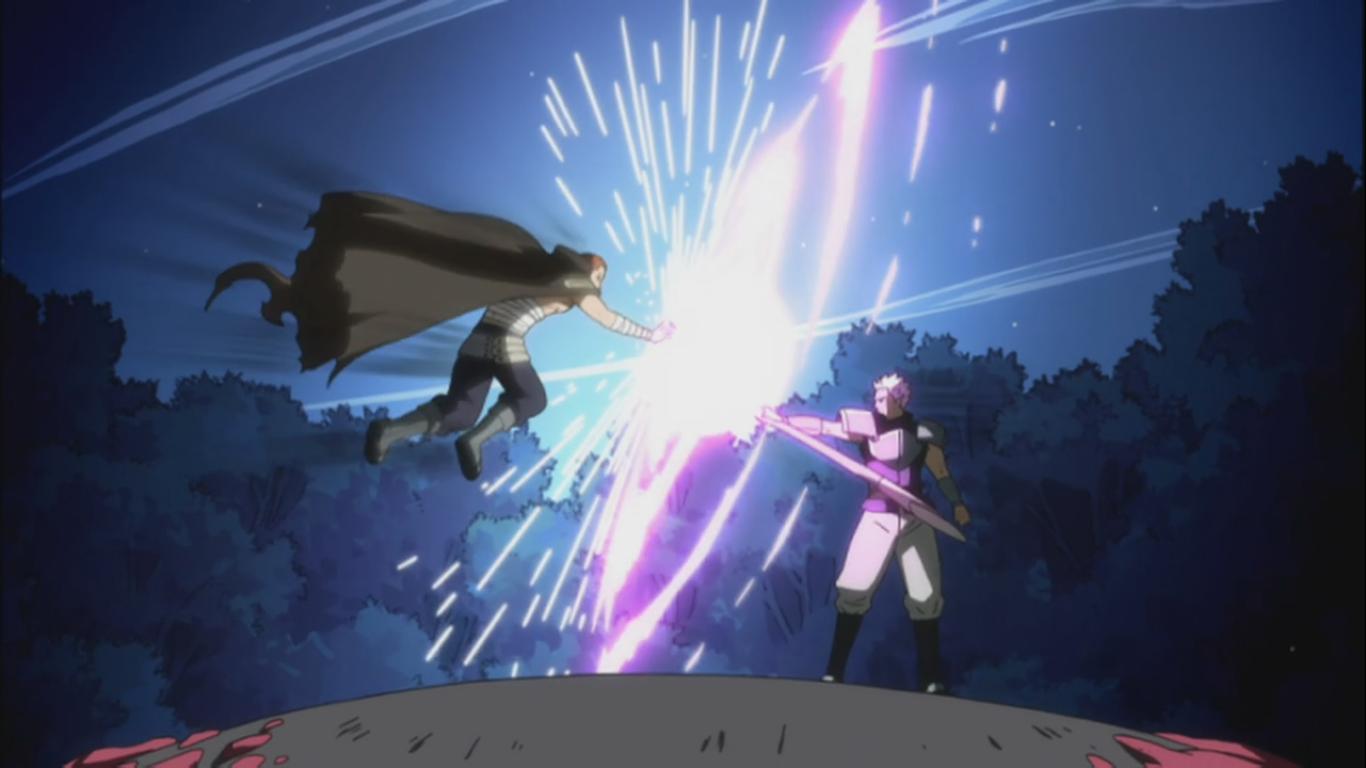 Byro tells Gildarts that he’s there to capture Lucy and that he’s got nothing to do with Fairy Tail Guild. He wants something which Lucy has, a clock hand which was given to her by her father. Gildarts and Byro go on a head to head match that it’s impossible for one of them to win. Erza joins Gildarts to help him. Gray joins Natsu to help him because his not able to fight in his current situation.