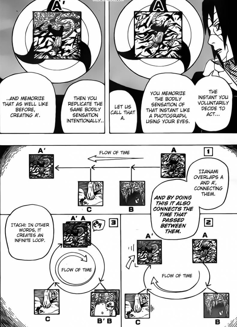 The instant you voluntarily decide to act, your memorize the bodily sensation of that instant like an image, but using his eyes. You replicate the same bodily sensation intentionally and memorize that as well like before which creates the same point again. Izanami overlaps the first point and the second point which connects them. By doing this it connects the time that passed between them. In other words, it creates an infinite loop. In exchange for Itachi’s eyesight.