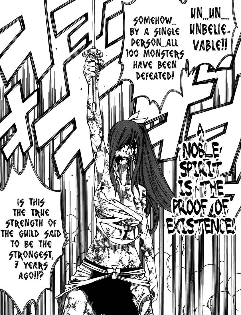 The Pumpkin tells her that it’s impossible because the Temple itself wasn’t designed for such a large number of monster at once. The battle starts and she absolutely slaughters the monsters with her sword. As she becomes covered with wounds, the fairy hat should have fallen to Earth dances. She keeps on going. Everyone is surprised at the number of monsters shes beat Even the Special Monster (Class S) is beaten by Erza even after being stated that it’s unlikely to be beaten by the a Wizard Saint.