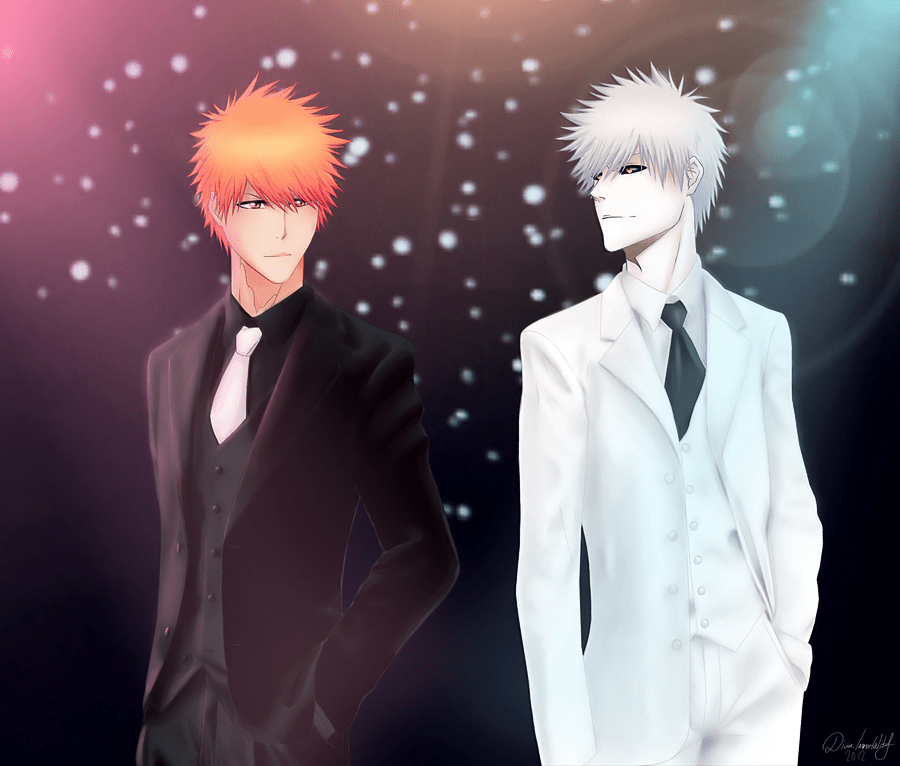 I’ve never seen both Ichigo and Ichigo’s Inner Self, Hichigo so calm. Both Ichigo and Hichgo pull off an impressive look as they are both ready to go to Prom. Possibly with a date, Orihime for Ichigo and Rukia for Hichigo would do just fine. The fact that both are the same, but Ichigo wears black with a white tie and Hichigo wears white with a black tie reminds me of their fights and how they are total opposites.