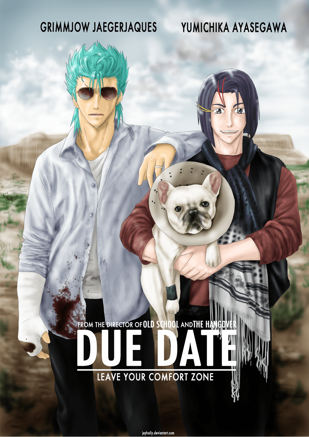 A pretty cool image of Grimmjow Jaegerjaquez and Yumichika Ayasegawa playing the part of Robert Downey Jr. and Zach Galifianakis on their Due Date movie poster. If you’ve seen the movie, you’d know how funny it is. Putting Grimmjow and Yumichika together would turn out to be pretty funny combination too.