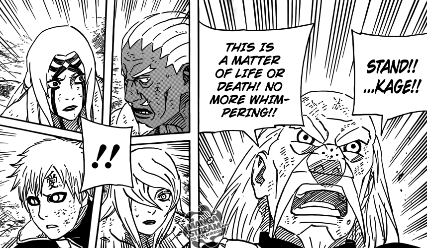 Onoki get’s the Kage’s spirit up by telling them that this is a matter of life and death, and that it’s very important. They should be able to deal with this because they are the people who their village chose as their Kage’s. They also need to make sure that their final words don’t ruin their reputation. Gaara tells them that Naruto had left this battle against Madara against them. Mei tells them that they took this battle away from Naruto, and that they have to win no matter what! They entrusted the titles of the 5 Kage to them, they can’t let the village’s down!