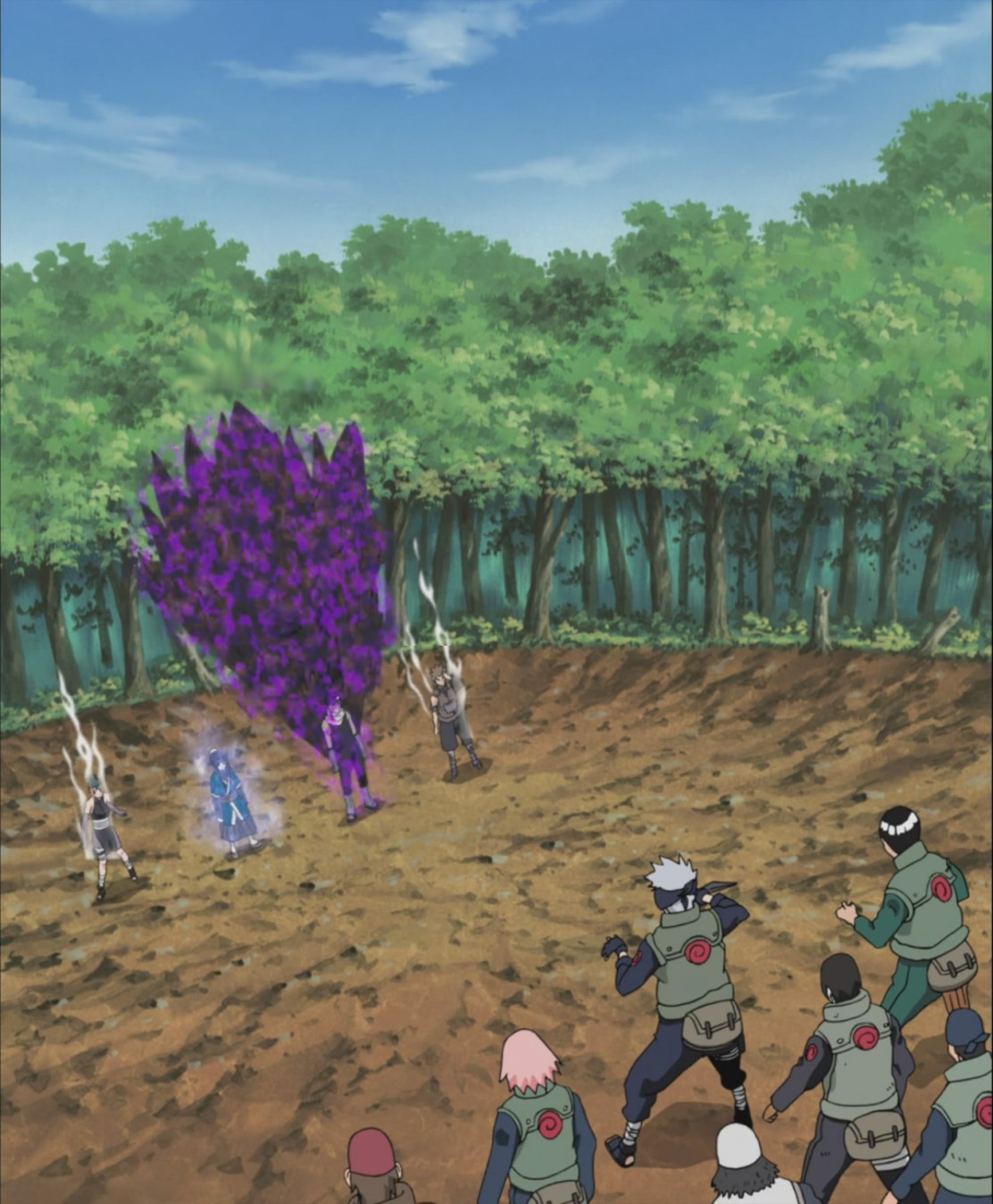 Haku uses his technique to create an ice mirror on top of Sai and Omoi and someone else. This destroys the bird and they fall to the ground. Sai, Omoi and the third person notice that they are Kekkei Genkai Shinobi’s, except for Zabuza. Zabuza, Haku, Gari and Pakura go for the attack when Kakashi, Might Gai, Lee and another person comes to help them. Sai thanks Kakashi for the help.