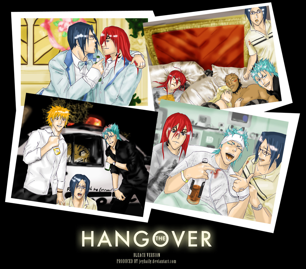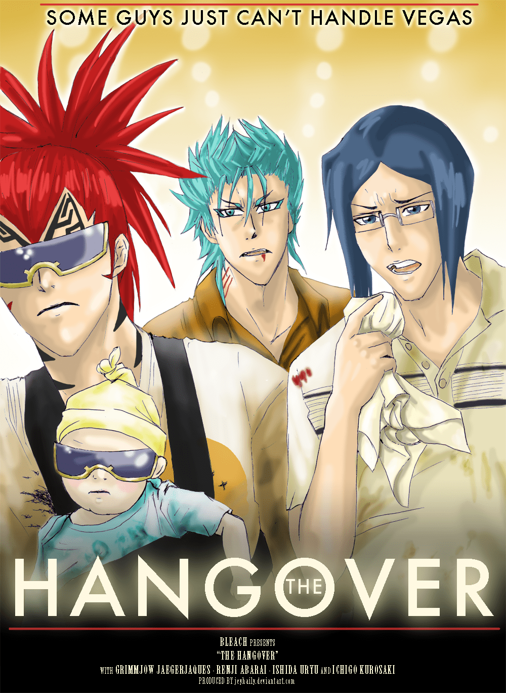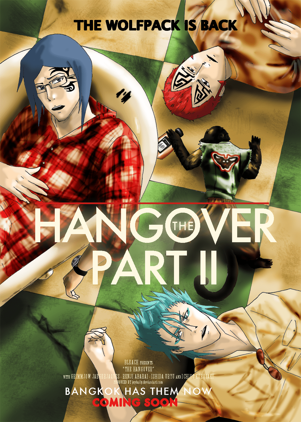 The funny images above of Part 1 and Part 2 of the movie Hangover with Bleach characters is extremely funny that I had to share it. Grimmjow Jaegerjaquez as Bradley Cooper, Uryu Ishida as Ed Helms and Renji Abarai as Zach Galifianakis. This combinations would have been awesome!