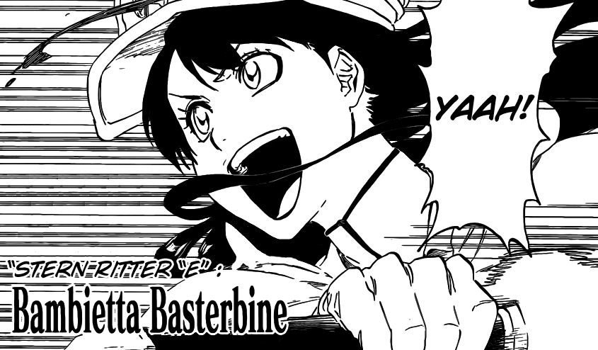 Somewhere else, another Sternritter “E” Bambietta Basterbine is going on a rampage with a smile on her face. She is stopped by the hands Sajin Komamura. He tells her that there’s even a little girl like her as a warrior of the Sternritter? She responds with the same thing but adding little puppy as Komamura. She then describes Soul Society really shorthanded as they would need such people as their captain.