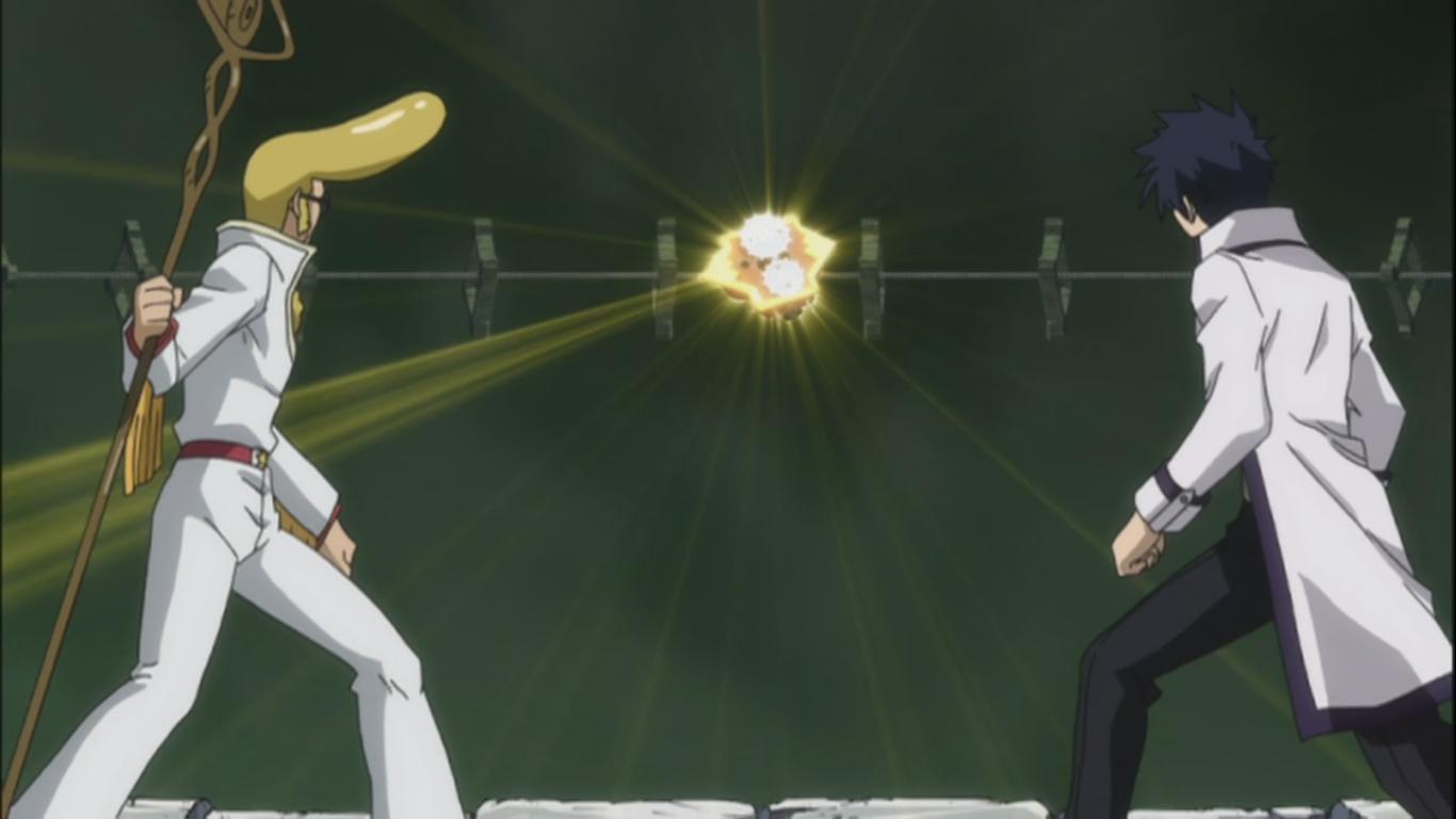 Gray and Sugar Boy both hold the click piece when Sugar Boy starts to come up with some weird gay drams about Gray. Sugar Boy uses an orange goo developed by Natsu and captures Gray. Lyon and Juvia are back. Gray breaks out from the Orange goo and uses his arrow and bow like attack. Juvia uses her Water attack and Lyon his Ice Make attack. They all attack him and obtain the Clock Piece. Lucy and the other also notice Dan and Coco at their paths waiting for them as they also want the clock piece. Fairy Tail 134 ends here.