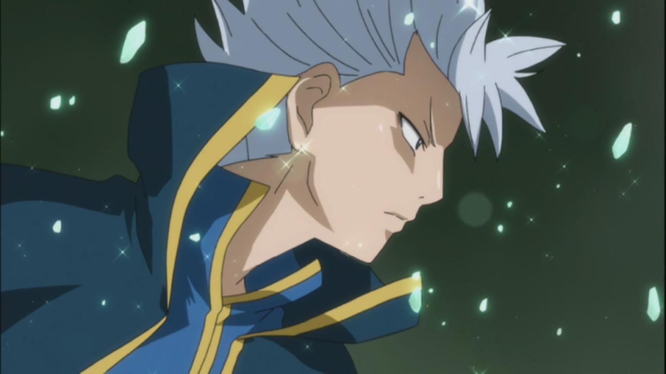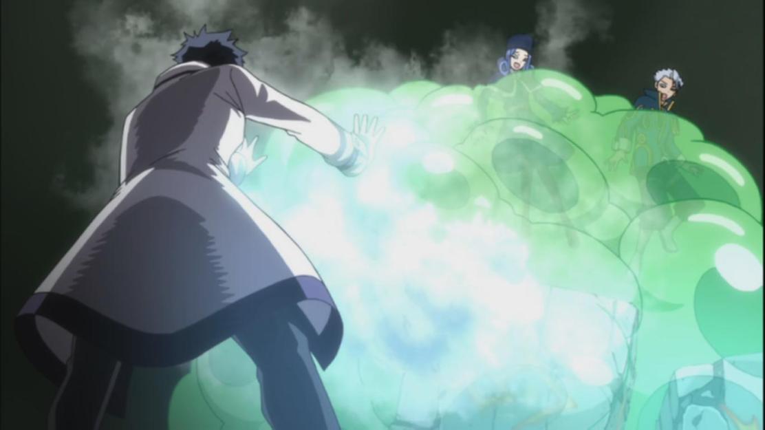 Gray, Juvia and Lyon are in another reality where they are able to change the direction of the rocks to make a path for them to walk on. They are faced by Sugar Boy. He captures Lyon and Juvia in his green goo and they are captured. He tries to help them but Lyon tells him that he should go and get and clock piece.