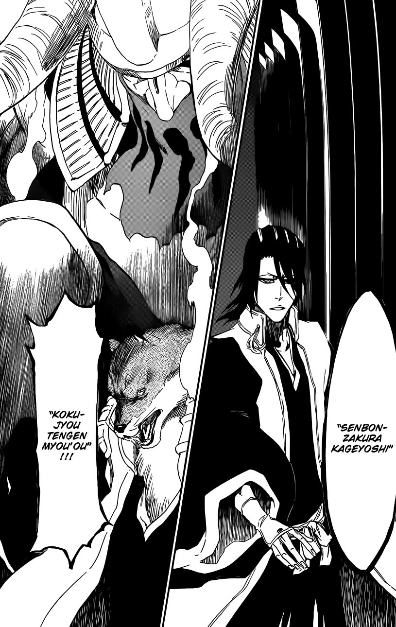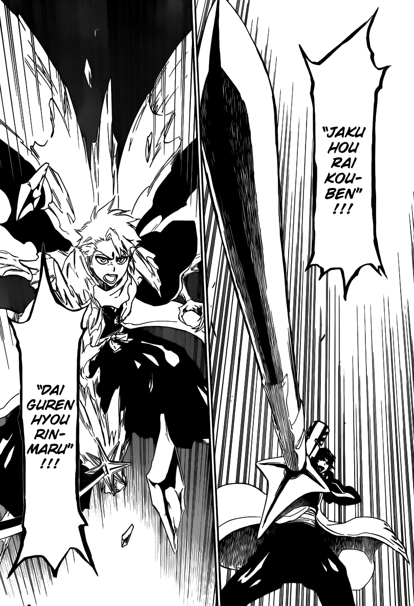 Komamura tells Testuzaemon Iba the same thing. Toshiro tells Rangiku Matsumoto the same thing because they want to find a way to break that seal which they have gotten. Soi Fong tells Marechiyo Omaeda the same thing. They all enable their Bankai’s. Byakuya with his Senbonzakura Kageyoshi, Komamura with his Kokujyou Tengen Myou’ Ou’. Soi Fong with her Jaku Hou Raikou Ben and Toshiro with his Dai Guren Hyourimaru! All the Quincies take out a circular object.