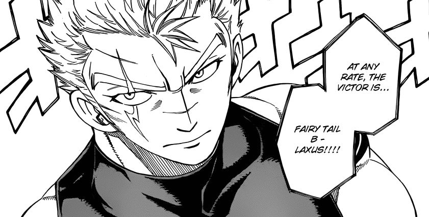 They are all down at this point, the last one is Kurohebi who using a hit by Laxus hand is thrown into the sky. Iwan notices that this is impossible as they have all been defeated! Iwan asks for mercy from Laxus as he is Laxus father and thus they are family! Laxus responds with his family is Fairy Tail! Laxus gives him a pretty hard pounding! The illusions all disappears! Every realizes that it was all an illusion.