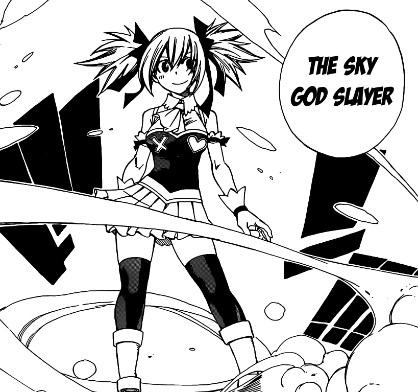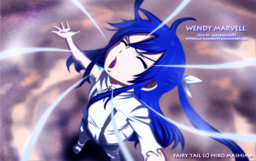 Chelia tells Wendy that she heard that there was someone from Fairy Tail that also uses Sky Magic. Wendy is currently hurt. Wendy tells herself that she was able to see her team mates like Elfman and Erza fight. Out of nowhere. Chelia uses her magic which hurts Wendy once more. Wendy notices they used their magic to defeat their foes.