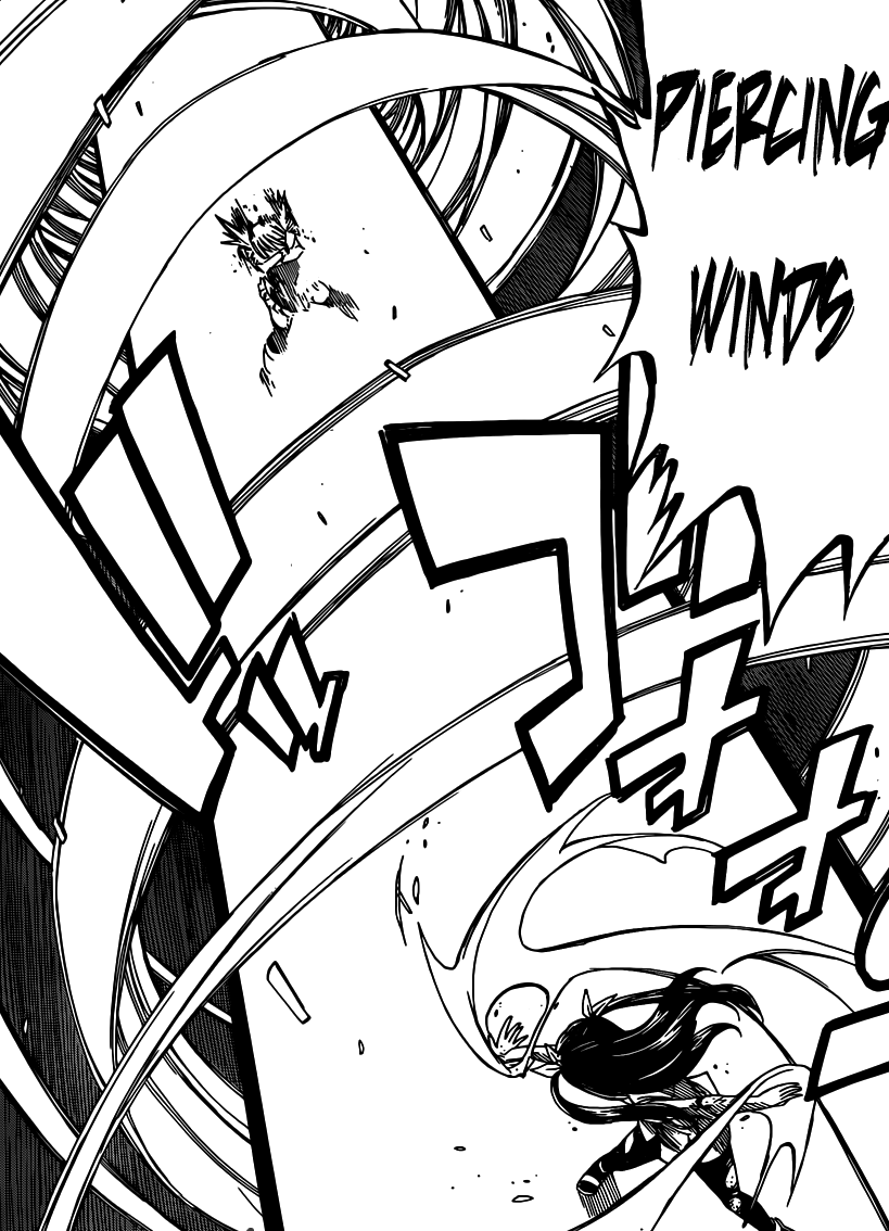 Piercing Winds calls out Wendy. A large wind bursts from Wendy which hits and injures Chelia largely. Everyone notices the great defeat. Lyon shouts out Chelia’s name. the pumpkin states that Chelia’s down, but after a few seconds Chelia gets up and it seems as though she’s not injured! Lyon states that she’s able to restore herself because of the magic she posses.
