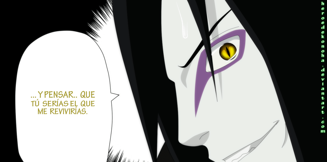 He tells him that it was started by someone else and that he is only interested is Sasuke’s body. Orochimaru tells him that he has no power to steal it because he was just recently revived. Sasuke hands over the scroll, Orochimaru asks why Sasuke wants to meet “them” for, unclear who them are. Sasuke tells Orochimaru that he currently knows nothing about it, he wants to hear everything from them.