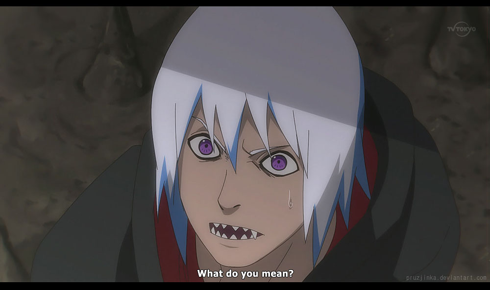 Suigetsu keeps on babbling and tells Sasuke that he’s probably take part in the war because he also wants to destroy Konoha! Suigetsu keeps on going when he says that no one wants to see Orochimaru again, nor do they need him screwing with their plans.