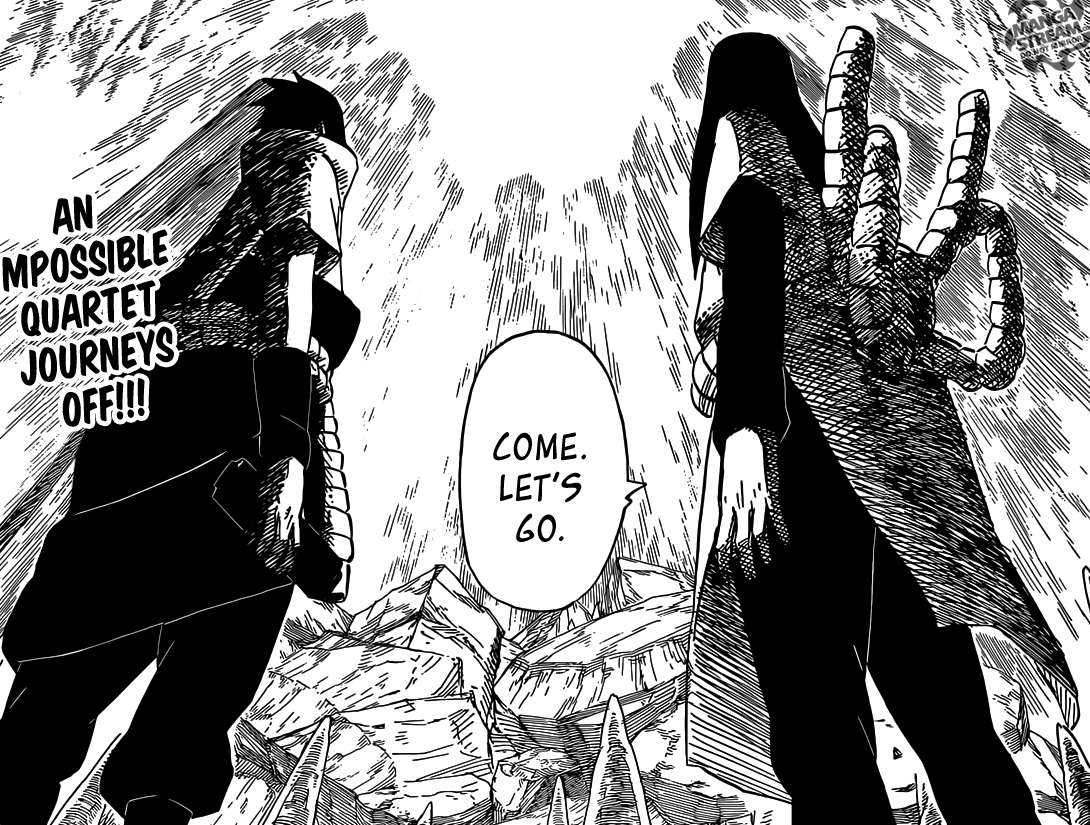 Orochimaru agrees and tells Sasuke that he’ll assist Sasuke with his journey. Sasuke asks where they are going, Orochimaru tells him that it’s a place where Sasuke knows very well. At this point, Sasuke faces Orochimaru and Orochimaru does the same to Sasuke! It seems that they are going to be transported somewhere! Naruto 593 ends here!