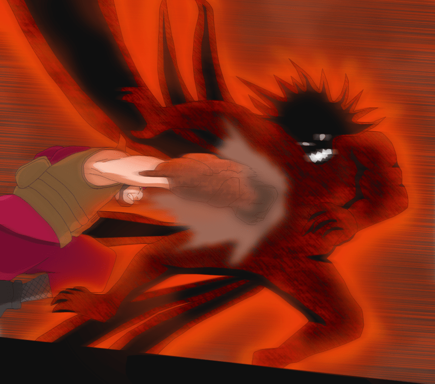 Tsunade asks the Raikage how they can have the Demon Fox’s Chakra Cloak as well as having their chakra, how are they able to have his form as well? Raikage tells her that they spend two weeks inside Kurama’s gut and only survived by eating the meat of its stomach! Someone tried to copy by eating a tentacle from the Eight-Tails but died, they are both special as they maybe distantly related to the Sage of Six Paths!